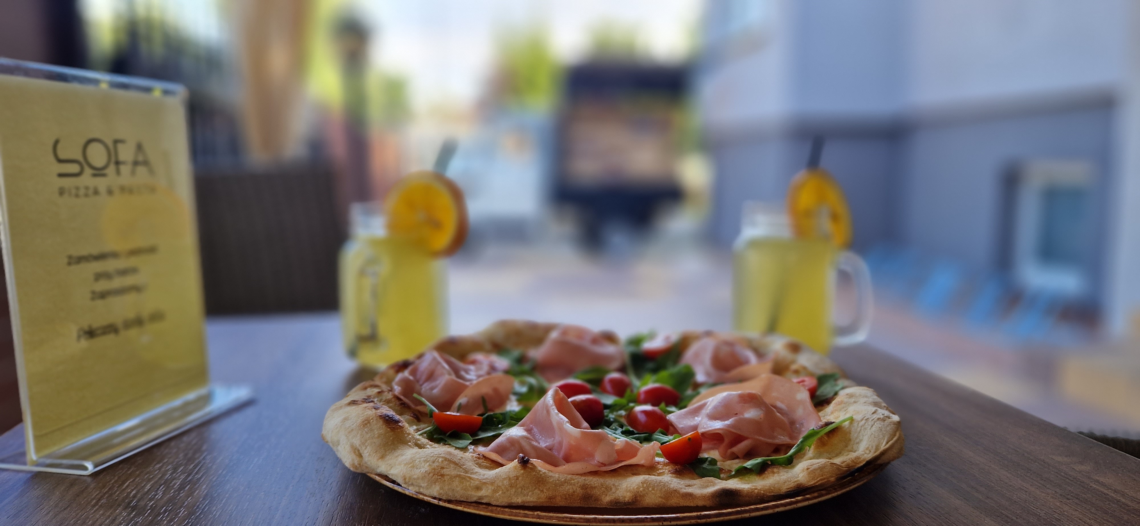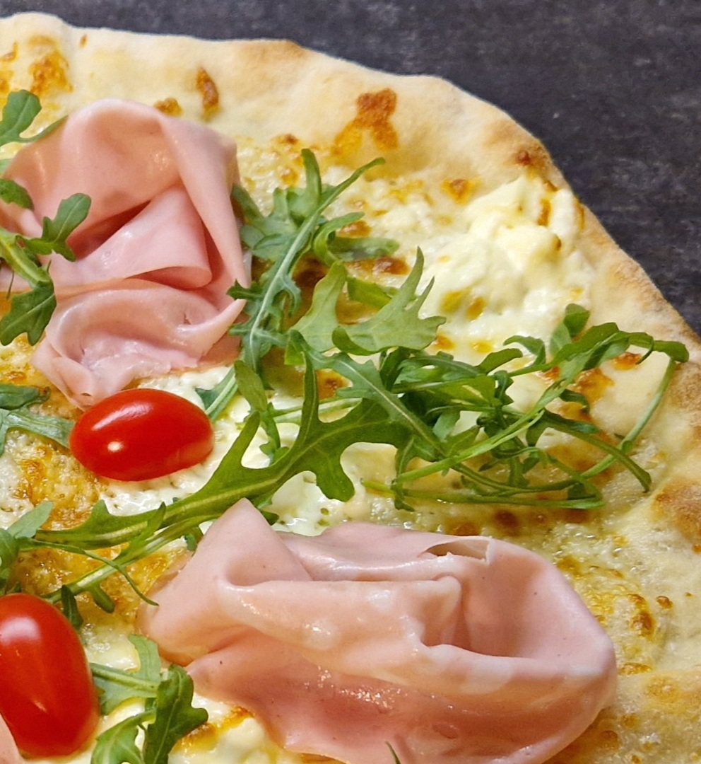 Sos pomidorowy, ser mozzarella, szynka parmeńska, rukola, pomidorki